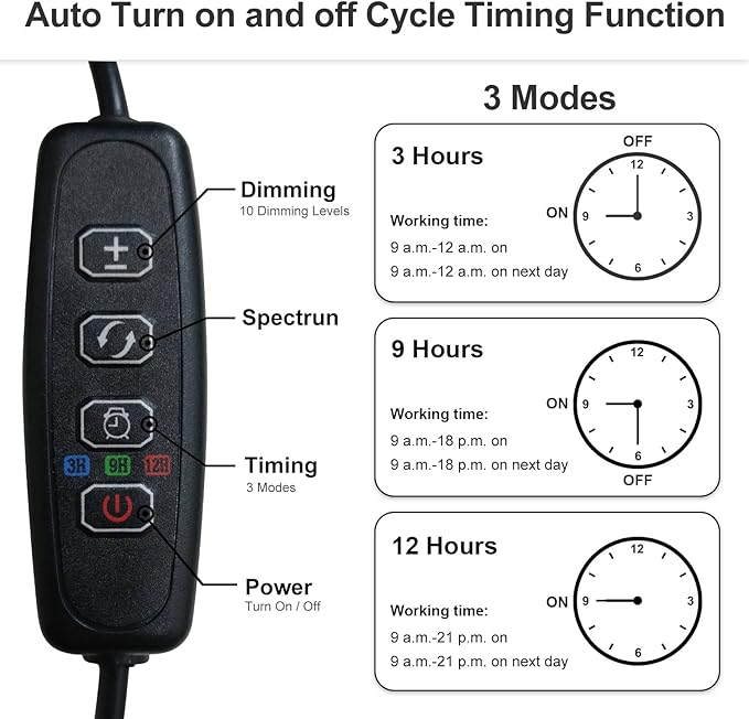 • This clip grow light offer the circular memory timer function with 3 options-3h/9h/12h. Set up once, the plant grow light will turn on and turn off automatically at the same time every day.