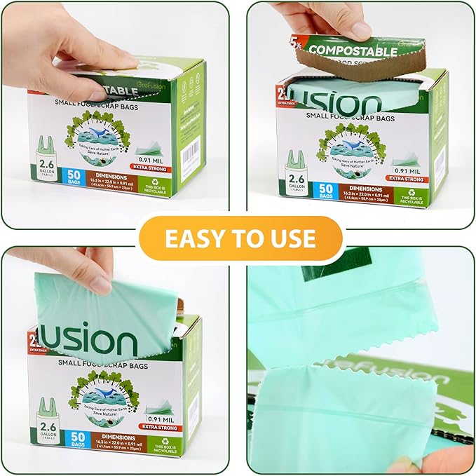 • 【2.6 GALLON COMPOSTABLE BAGS&UPDATE THICKER BOTTOM 】Even liquids gather at the thicker bottom but with no tear . The kitchen trash bags features of sturdy same as regular plastic bags but more ecofriendly than it.If you're tired of cleaning your compost bin every day or using flimsy trash can kitchen bags causing spilling out, Now the Surper Strength GreFusion garbage bags is a great life saver for your Health & Household cleaning working.