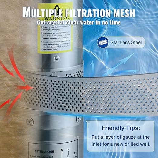 • Trouble-free Check Valve & Filter: This well pump has a built-in check valve to prevent back-flow (an additional check valve is highly recommended). The stainless steel filtration mesh is designed to filter impurities. You can add a layer of gauze in front of the filtration inlet for a new drilled well that may contain excessive granular sediment. Keep impurities out without the headache.