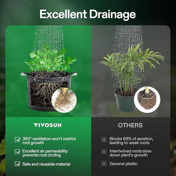 • Breathable: The nonwoven fabric ensures that your plant roots stay aerated and are air-pruned inside the grow bag, which keeps their roots from circling and makes them more efficient when absorbing nutrients with an overall healthier root structure
