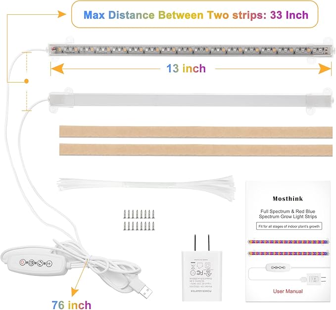 • Easy Installation with total Mounting Kits for Plant Shelf or Under Cabinet - The grow light bar set comes with 8 screws , 2 double-sided tapes and 6 ties. Compact design fits for various fixtures and surfaces. The power cord is 78 inches long for easy using in office,home,plant shelf, indoor greenhouse etc