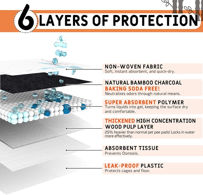 • Dry Surface with Moisture Wicked Away- With an instant absorbent surface, a thickened high concentration wood pulp layer(25% heavier than normal pee pads!) to absorb liquids, and a polymer core to turn the absorbed liquids into gel instantaneously to lock in water, this cage liner will diminish the moisture that can potentially spread and keep the surface dry for a whole day.