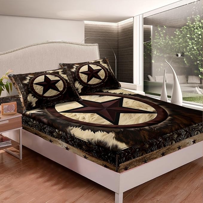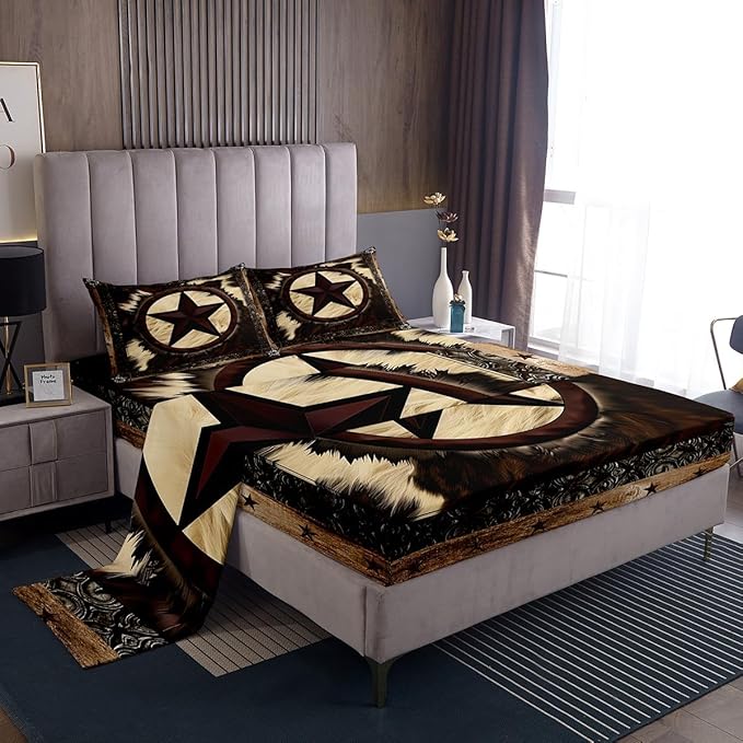 Cow Sheet Set Twin for Rustic Decor,Western Texas Star Bed Sheets for Cowboy Cowgirl,Vintage Cowhide Bedding Set,Farmhouse Highland Cow Fitted Sheet + Flat Sheet + 1 Pillowcase Bedroom Decor