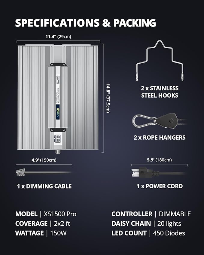 • Energy Efficient, Durable: Compared to traditional 250W HPS/MH, draws only 150W; suites for 3x3 ft veg & 2x2 ft flowering, 2pcs XS1500 Pro plant lights are perfect for 4x2 grow tent; quality aluminum heatsink is the key to heat dissipation & long lifespan