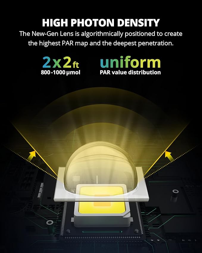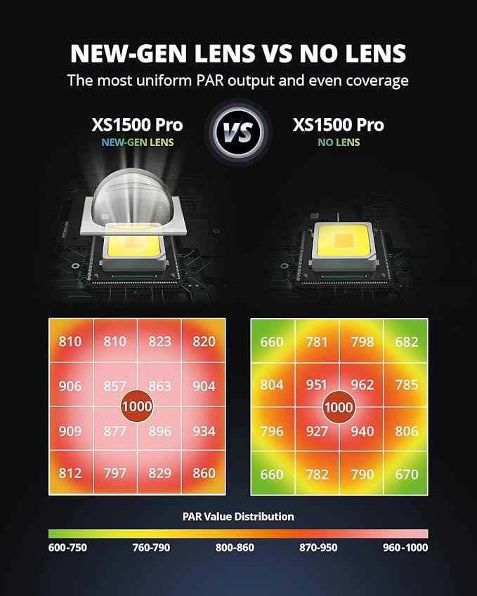 • Optical Lenses Design: Enables the XS1500 Pro LED grow lights for indoor plants to concentrate light with minimal loss, and achieve the most uniform PPFD at all corners for optimal photosynthesis, fostering balanced & healthier growth for higher yields