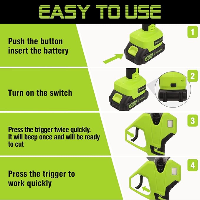 • 【Easy Use & Ergonomic Design】:After pressing the power button, the electric pruner will remain inactive until you rapidly press the trigger twice, which helps prevent accident. If the trigger is not pressed for 60 seconds, the electric branch shears will go into auto-sleep mode to prevent accidental cutting. Quickly pressing the trigger twice returns it to life. The handle is ergonomically designed to offer maximum comfort. It includes cushioned grip for an effortless trimming experience.
