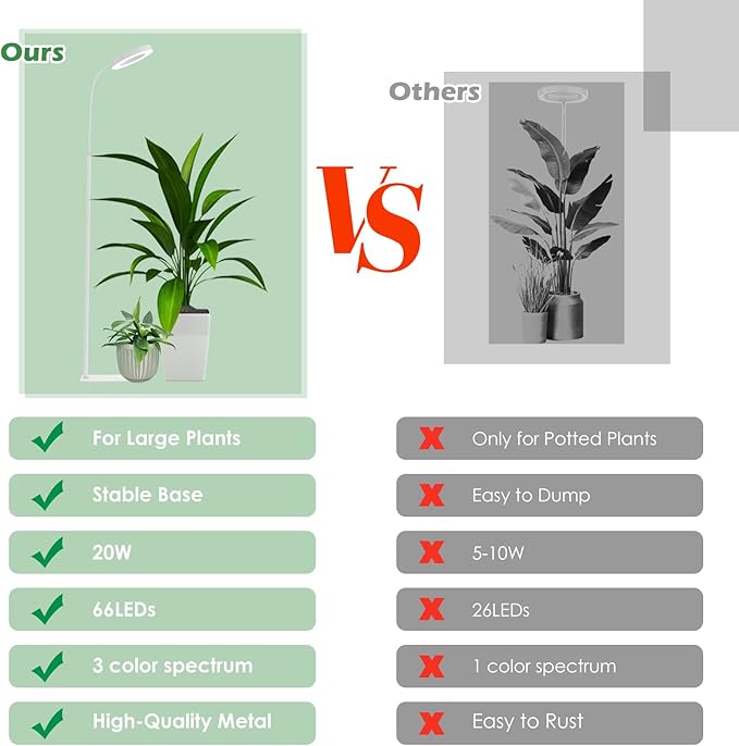 • 【Stable Base & 12-Month Warranty】This standing grow light is designed for long-term use. It features a stable, all-metal stand that prevents tipping and long-life LEDs rated for over 50,000 hours 50,000 hours. We stand behind its reliability with a solid 12-month warranty.