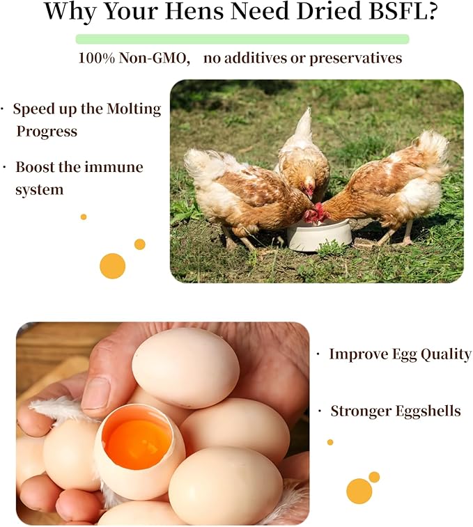 • 【Rich in Calcium】Black Soldier Fly Larvae are rich in calcium, containing at least 85X more calcium than dried mealworms and boasting a protein content of 42%-45%. Enhance your chickens' health by feeding them these nutritious treats, leading to larger eggs and increased productivity