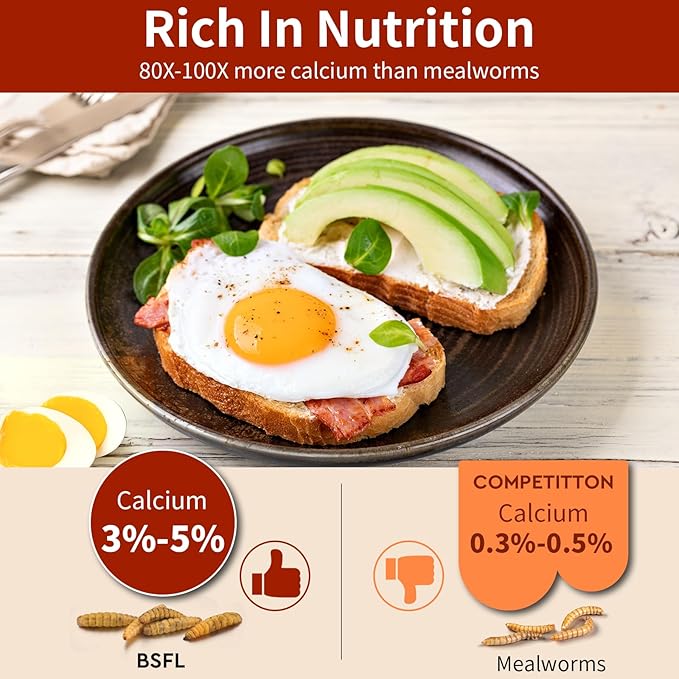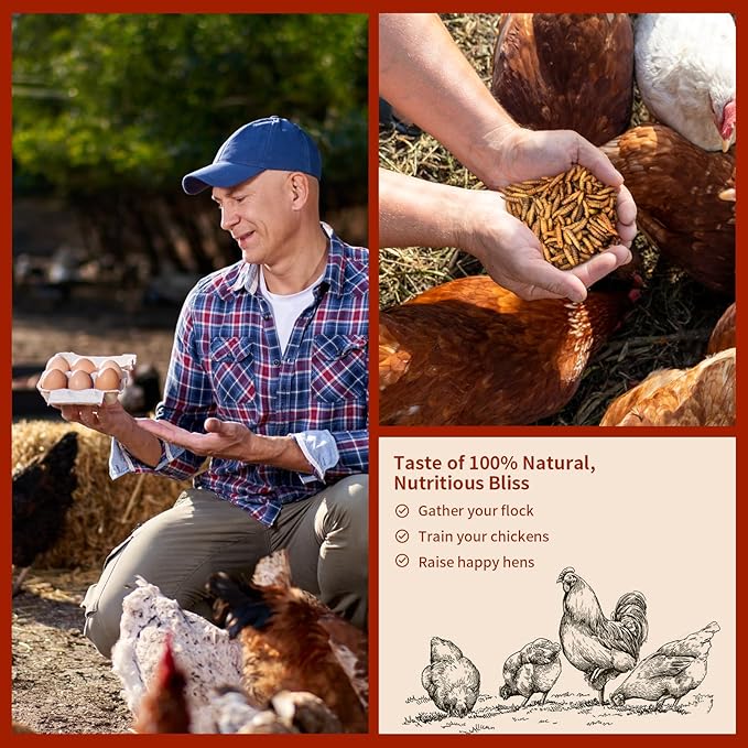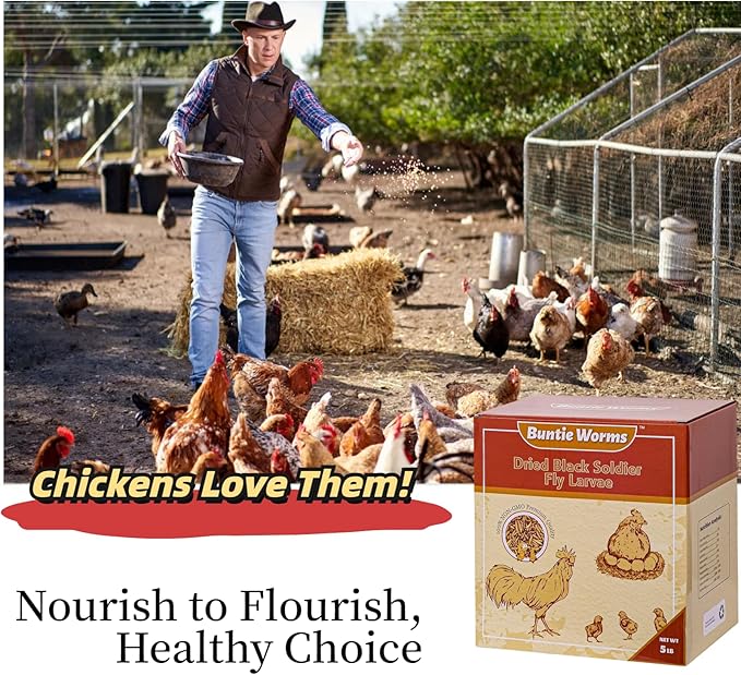 • Chickens love These: Treat your chickens to a delicious and nutritious snack with our Black Soldier Fly Larvae. Your backyard friends will love the taste! Your chickens will be delighted with every delicious bite, ensuring their happiness and health
