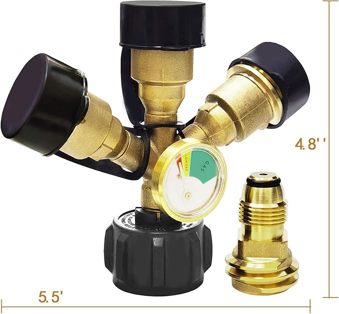 • ❤【100% - Satisfaction Guarantee】The kit includes: 1 pack 3 Way Propone Y Splitter Adapter with Gauge and Shut Off Valve 1 Pack LP Propane Tank Converts POL Adapter + 1 PC Roll Sealing Tape. If you're not satisfied with this item at any time within two years after purchased, we'll provide a refund or replacement.