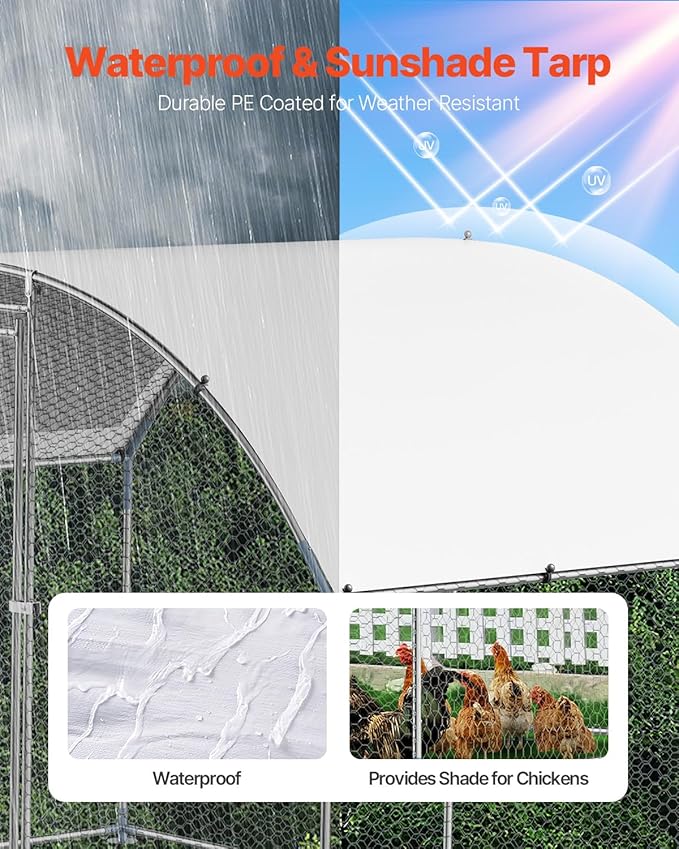 • Large Metal Chicken Coop with Cover: If you're a pet lover, you know how crucial it is to give your furry friends a secure and comfortable shelter. That's why VEVOR's chicken coop is the perfect solution! Built with a sturdy metal frame and a durable sunproof cover tarp, this coop is designed to last.