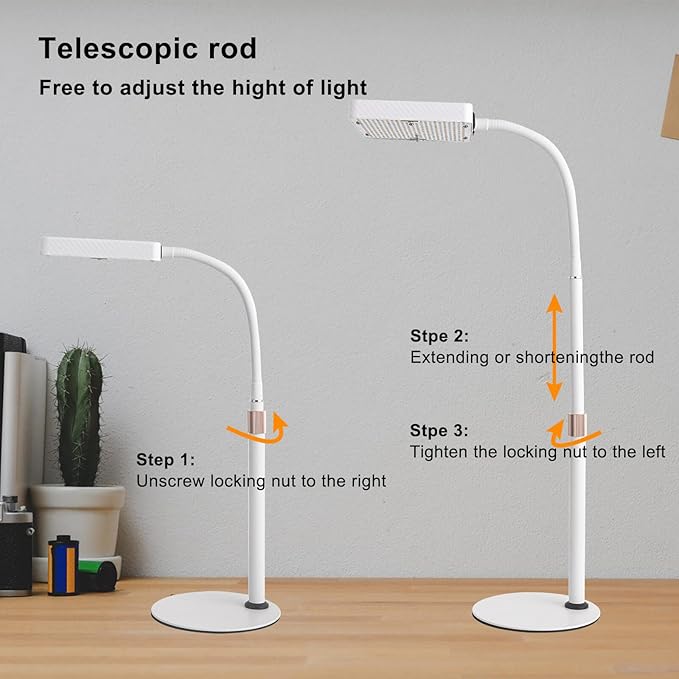 • 【Stable Base and Adjustable Height Stand】This desk grow light with base and stand, you can stand it on desk and adjust the lamp head height according to your application from 16” to 24”.