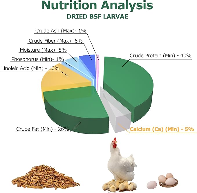 • Feathers and Eggs Flourish: Indulge your poultry with Dried BSF Larvae, known to enhance feather quality and stimulate egg production, resulting in healthier, more abundant eggs.