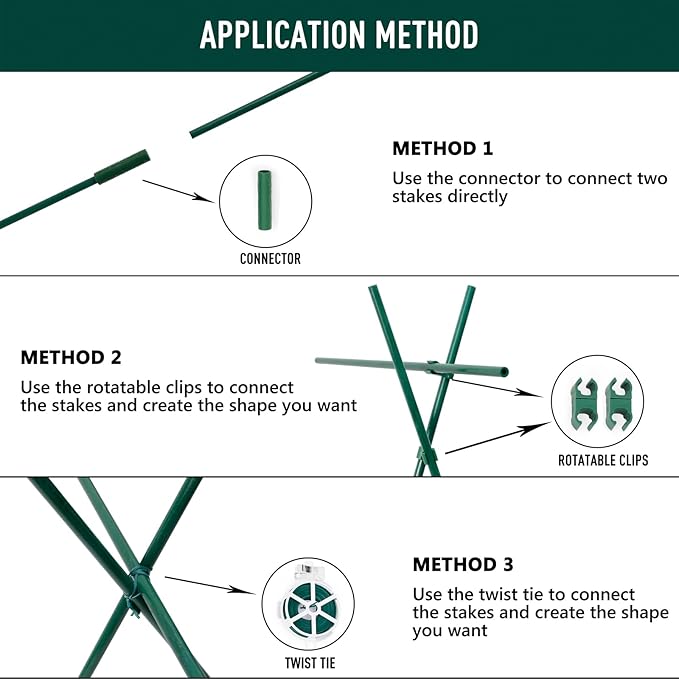 • 【Easy to Assemble】 Connect a desired number of stakes using connectors according to your specific needs. Use the rotatable clips or the twist tie to build an "X" or any other shape you want.