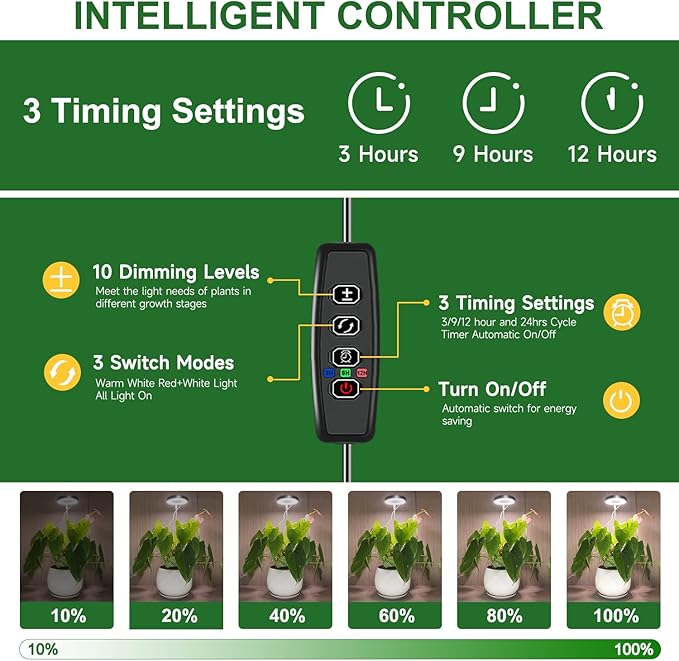 • 3 Lighting Modes and 10 Brightness: The full spectrum plant grow light offers 10 levels by pressing the button. 3 lighting spectrum “white light, warm white and red, Mix Lighting”. you have more options to meet different illumination requirements.