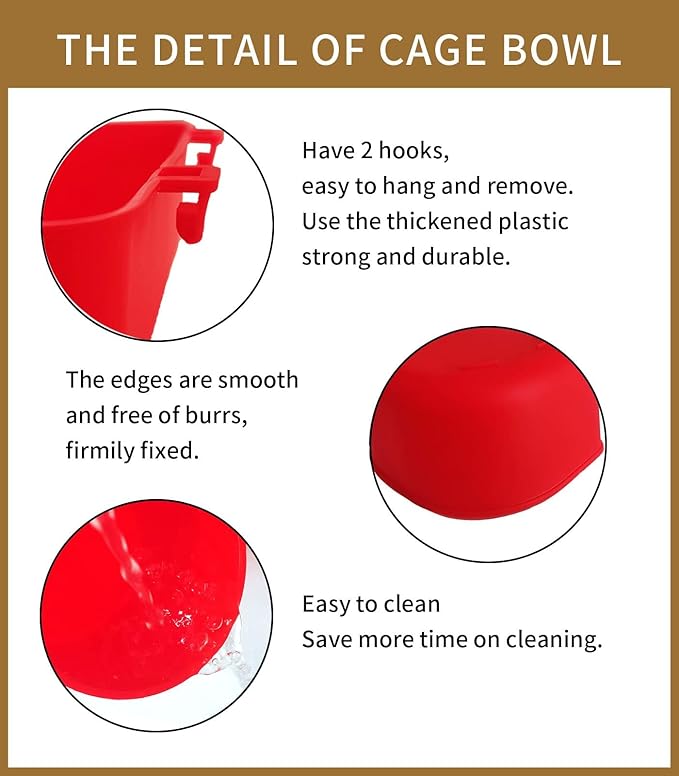 • 【High Quality】the material of food drinking feeder is quality plastics, odorless, wear-resisting,durable. The edges of the pet bowl are smooth without burrs. Very safe for your birds poultry rabbit chicken and small animals.