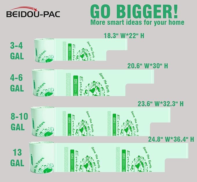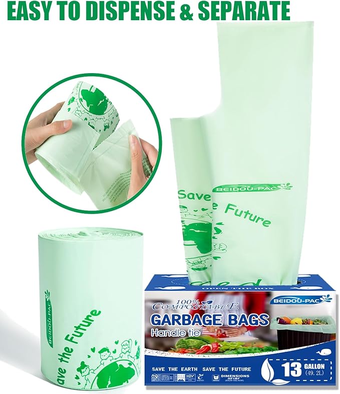• [TALL KITCHEN COMPOST BIN COMPATIBLE] -- BEIDOU-PAC Compostable Bags, 13 gallon (49.2 liters) 24.8" x 36.4" x 0.9 mils, 30 bags per roll, home compostable and biodegradable are compatible with a backyard compost system. Our compost trash bags can perfect for 13-gallon under-the-sink kitchen trash can.