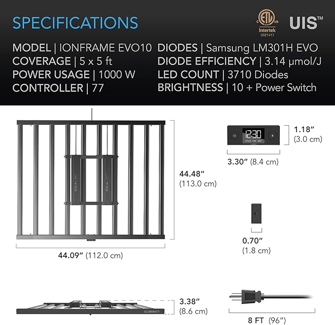 • 7 x 7 ft. Veg. Coverage | 6 x 6 ft. Flower Coverage | Samsung LM301H EVO Chips | 3710 Diodes | 1000W | 2146 PPFD | ETL Cert. 5021417