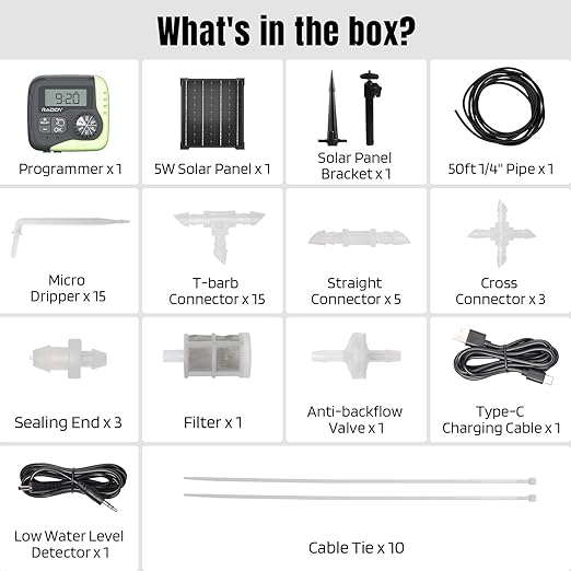 • Easy Installation: The Raddy WS-1 makes installation a breeze with its complete kit, including a programmer, a 5W solar panel, micro drippers, a 50-foot-long 1/4'' pipe, and various connectors. Start using it right away and create your own DIY auto-irrigation system effortlessly.