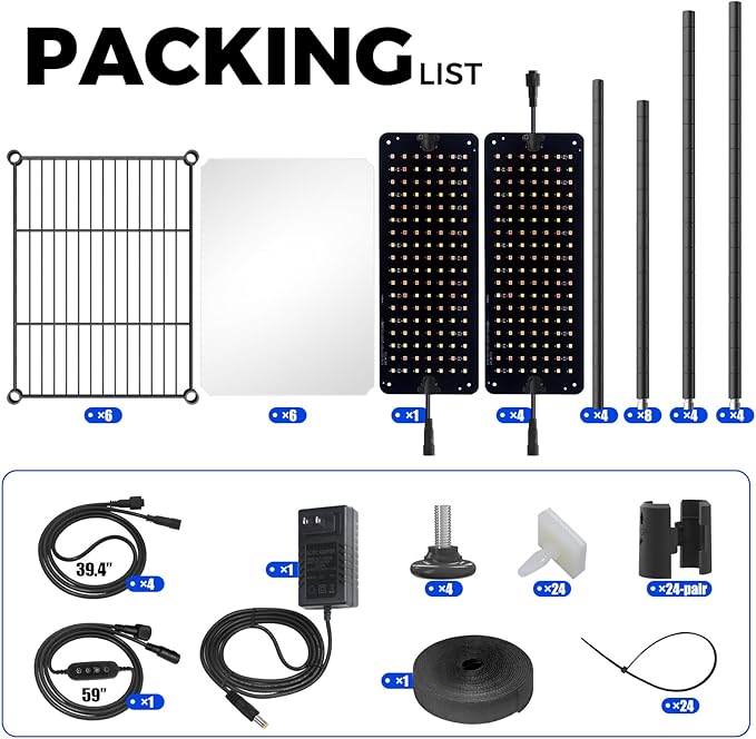 • What You Get: 5 x Barrina Grow Light Panel, 1 x AC/DC Adaptor, 1 x Power Cord with Turn On/Off Timer, 4 x Connecting Cord, 1 x Hook and Loop Tape, 24 x Snap-in Adhesive, 24 x Cable Tie, 6 x wire shelf, 6 x PP pad, 1 x Accessory Kit for Plant Shelf, 1 x Installation Manual