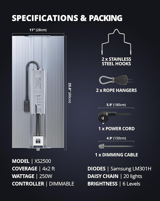 • Top 4x2 Grow Light: Use Samsung LM301H diodes with upgraded scientific distribution for more even PAR map & deeper canopy penetration; daisy chain max 20pcs XS2500 for commercial, horizontal or vertical farming, greenhouse planting and hydroponics growing