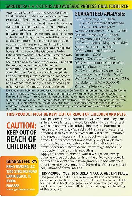 • 🍊 Promote vigorous growth and achieve bountiful yields in your citrus and avocado plants with Gardenera Citrus & Avocado Plant Food. Our carefully balanced 6-4-6 formula is specifically designed to provide the perfect combination of essential nutrients to support the optimal health and productivity of your plants.