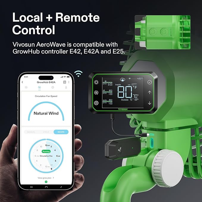 • Smart Wi-Fi Control: The AeroWave E6 is compatible with the Vivosun Grow Hub E42/E42A/E25, to remotely control speed and ON/OFF timer settings; You can connect this device to the SGS to have the device synch with your grow recipes and to operate in tandem with other smart devices