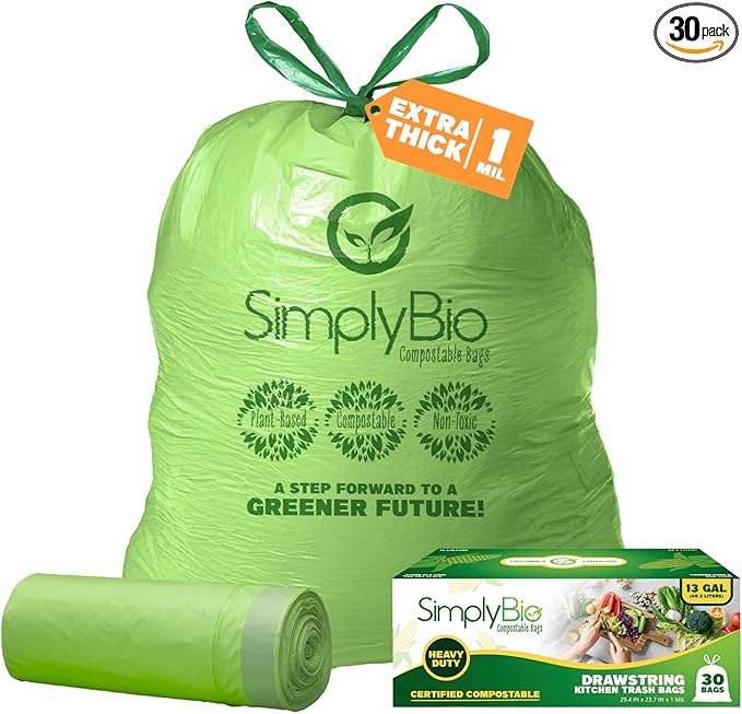 • Convenient Size and Packaging: These Simply Bio 13-gallon compostable trash bags, equivalent to 49.2 liters, are 1 mil thick. Each roll contains 30 bags, equipped with a drawstring for easy closure. Sized at Width 23.7 in. x Height 29.4 in.