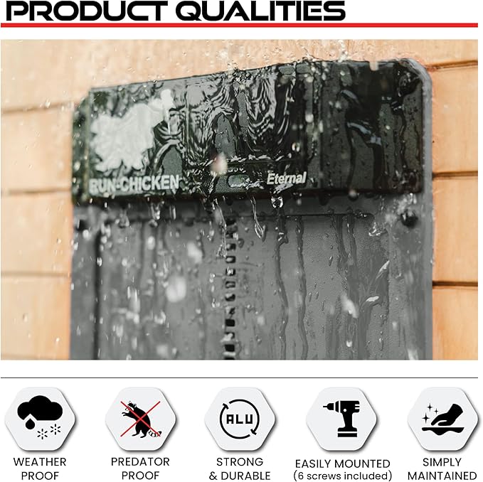 • Strong and durable – sturdy all-aluminum body easily keeps predators out. High-quality powder coating makes the solar chicken door resistant to snow, rain, heat, and dust. This eco-friendly, solar power chicken coop door will last for many years.