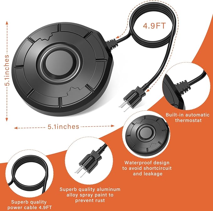 • 120W Constant Temperature Control Bird Bath Heater: Newly upgraded thermostatically controlled outdoor bird bath deicer to prevent water from freezing in winter. Power is upgraded to 120W with higher thermal conductivity for rapid deicing and heating, ensuring your birds or farm animals can enjoy warm, mild water in minutes.