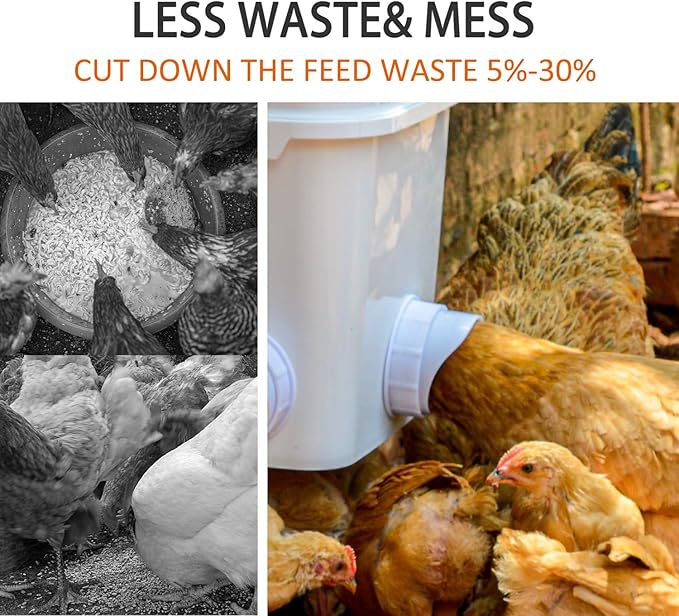 • The chicken feeder was equipped with a lid to keep the feed dry and clean; the feeder port reduces the spillage to cut down the feed waste by 5%-25%, keep the coop less mess