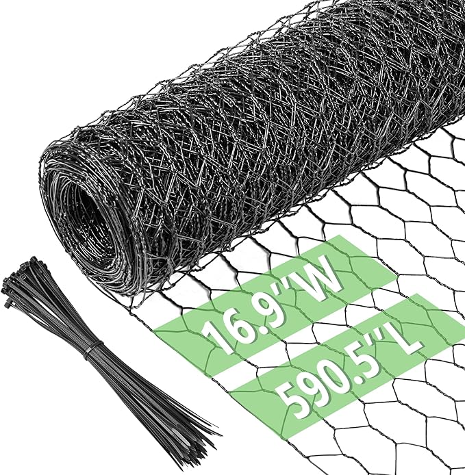 Chicken Wire 16.9 in x 590.5 in Poultry Wire Netting Hexagonal Galvanized Mesh Garden Fence Barrier for Pet Rabbit Chicken Fencing with 100 Pcs Cable Zip Ties(PVC-Coated)