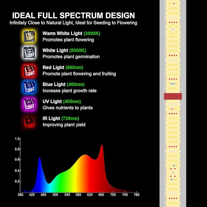 • IDEAL FULL SPECTRUM & DIMMING - AGLEX 800W led grow light consists of full spectrum Warm White3000K, Cool White 5000K, Blue 460nm, Red 660nm, UV 405nm and IR 730nm, is infinitely close to natural sun light, perfect for seeding to flowering, applied to the whole stages of indoor growing plant. Growing lamp 800w comes with flexible dimmable function, 4-level dimming knob from 0-100% available, convenient to adjust the brightness according to the plants at different growing stages.