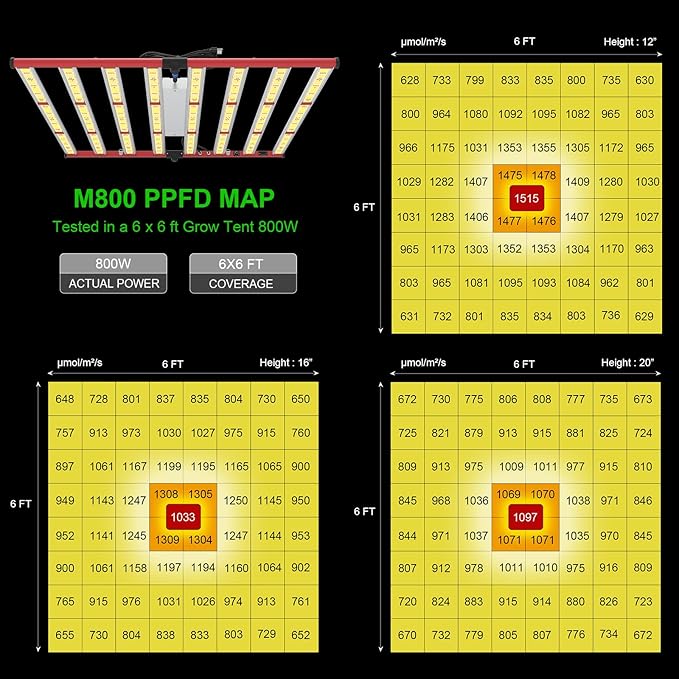 • MAXIMIZE YIELDS & CROP QUALITY - AGLEX M800 led plant growing light is with 2720PCS high efficient chips, only consumes 800w with 2720 leds, achieving higher average PPFD with 1515muol/㎡/s at 6x6ft core coverage. The average yield is more than 2.8g per wattage. The 800w led bar grow light can help you achieve maximum quality and quantity. Wide Input Voltage 100-277V, can meet most input voltage.