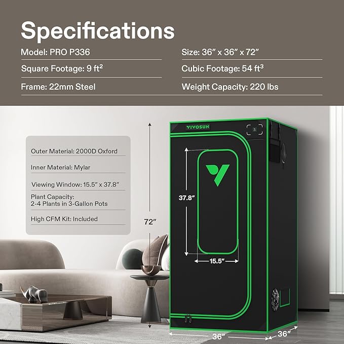 VIVOSUN P336 36"×36"×72" PRO Grow Tent, with Thick 1 inch Poles, Strengthened High Reflective Mylar Oxford Fabric, Extra Hanging Bars & High CFM Kit for Hydroponics Indoor Plant for AeroLight A200SE