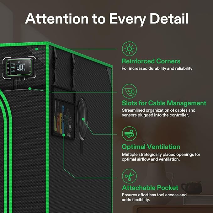 • Upgraded Lightproof Fabric: Durable 2000D Oxford canvas lined with plant-friendly PE and 100%-reflective Mylar; The three-layer thick fabric ensures zero light leaks, boosting the output efficiency of your setup; Zipper section is designed with black inner lining for enhanced light prevention
