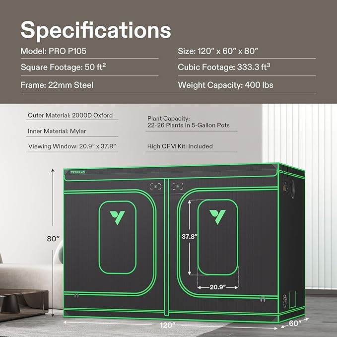 VIVOSUN P105 120"×60"×80" PRO Grow Tent, with Thick 1 inch Poles, Strengthened High Reflective Mylar Oxford Fabric, Extra Hanging Bars & High CFM Kit for Hydroponics Indoor Plant for VSFD6500×2