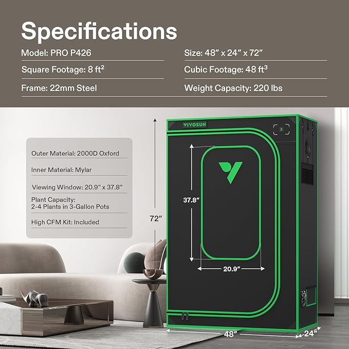VIVOSUN P426 48"×24"×72" PRO Grow Tent, with Thick 1 inch Poles, Strengthened High Reflective Mylar Oxford Fabric, Extra Hanging Bars & High CFM Kit for Hydroponics Indoor Plant for AeroLight A200SE