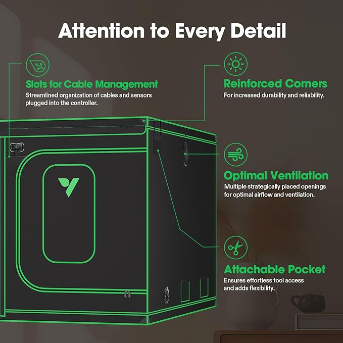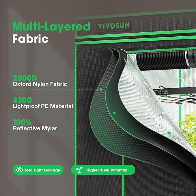 • Upgraded Lightproof Fabric: Durable 2000D Oxford canvas lined with plant-friendly PE and 100%-reflective Mylar; The three-layer thick fabric ensures zero light leaks, boosting the output efficiency of your setup; Zipper section is designed with black inner lining for enhanced light prevention