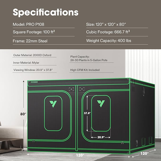 VIVOSUN P108 120"×120"×80" PRO Grow Tent, with Thick 1 inch Poles, Strengthened High Reflective Mylar Oxford Fabric, Extra Hanging Bars & High CFM Kit for Hydroponics Indoor Plant for VSFD6500×4