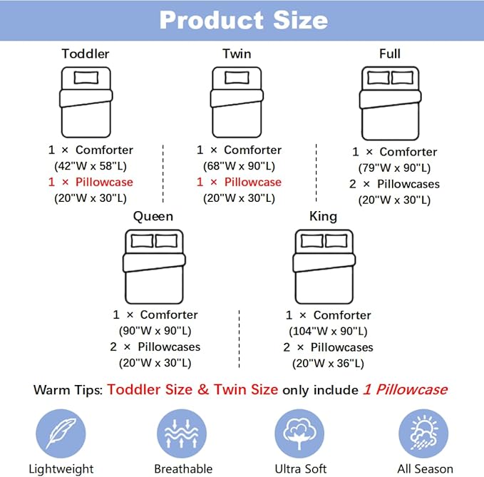 • Package and Size: This comforter set include 3 Pieces. Available in comforter Full: 1 comforter 79"x90" and 2 pillowcases 20"x30"