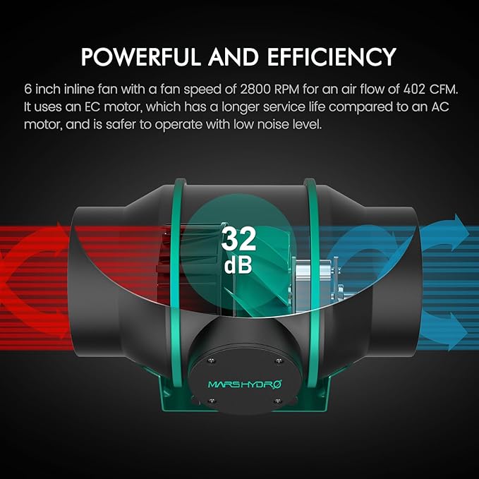• 【402CFM Adjustable&Efficient Ventilation System】The inline fan blades have a mixed flow design to provide active air to your growing space, the fan runs at 2800 RPM,adjustable from 0 to 100%,and provides 402CFM of airflow.Only 32 dB noise.1050+ RC 48 Australian Virgin Charcoal with 25ft length flex ducting,effectively filters impurities and odors from the air.