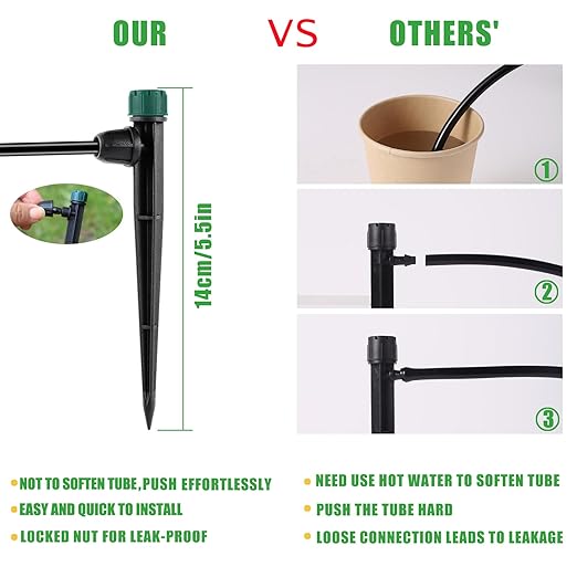 • 【Measurement】Emitters:works perfectly with 1/4 inch drip irrigation tubing, ideal for 4mm(inner)-7mm(outer) garden watering system;Irrigation dripper stake height: 5.5 inch.Please pay attention to the specifications before purchasing