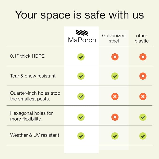 • Tough & Versatile: The MaPorch Plastic Wire Mesh Fence is your go-to for a garden fence or animal enclosures. Made from super strong ABS plastic, this green mesh doesn't back down from rough weather or curious critters, keeping your space secure with style