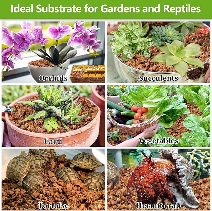 • Wide Application: Coco chips are suitable for garden planting, indoor flower pots, potting mixes, seed germination, raised garden beds, etc, promoting healthy root growth and rapidly expands the root system; Ideal for cacti, succulents, herbs, vegetables, microgreens and hoyas; It can also be used for reptile substrate and improve the living environment for pets