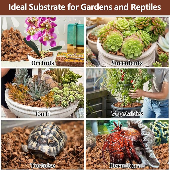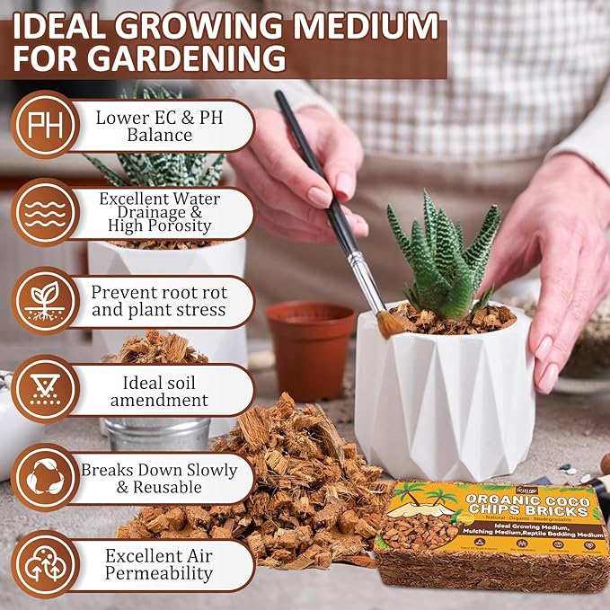 • Wide Application: Coco chips are suitable for garden planting, indoor flower pots, potting mixes, seed germination, raised garden beds, etc, promoting healthy root growth and rapidly expands the root system; Ideal for cacti, succulents, herbs, vegetables, microgreens and hoyas; It can also be used for reptile substrate and improve the living environment for pets