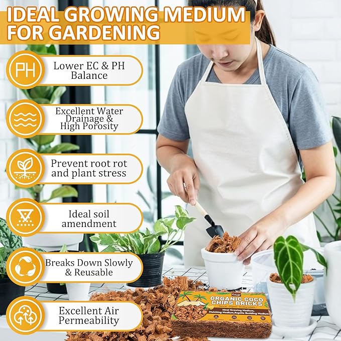 • Wide Application: Coco chips are suitable for garden planting, indoor flower pots, potting mixes, raised garden beds, etc, promoting healthy root growth and rapidly expands the root system; Ideal for cacti, succulents, herbs, vegetables, microgreens and hoyas; It can also be used for reptile substrate and improve the living environment for pets
