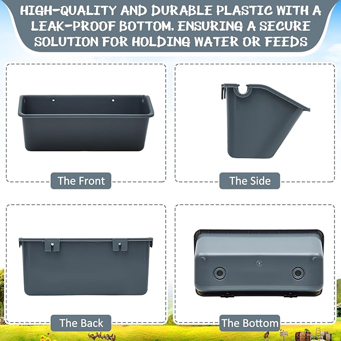 • Chicken Feeders Set: the chicken feeder is a set of deep grey feed troughs with a substantial capacity of approximately 5 quarts each; The practical goat feeders are designed with a solid base, having no holes, to ensure secure installation, the kit provides metal D shaped metal clips and expansion screws; Various quantities available for you to choose from, it's a versatile choice for chickens, ducks, geese, goats, pigs, horses, and dogs