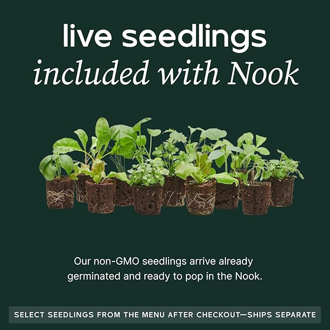 • What’s in the box: Farmstand Nook hydroponic system with LED lights, Grow Cups, water pump, Smart Timer, nutrients for 130+ plants, scoops, and pH kit.