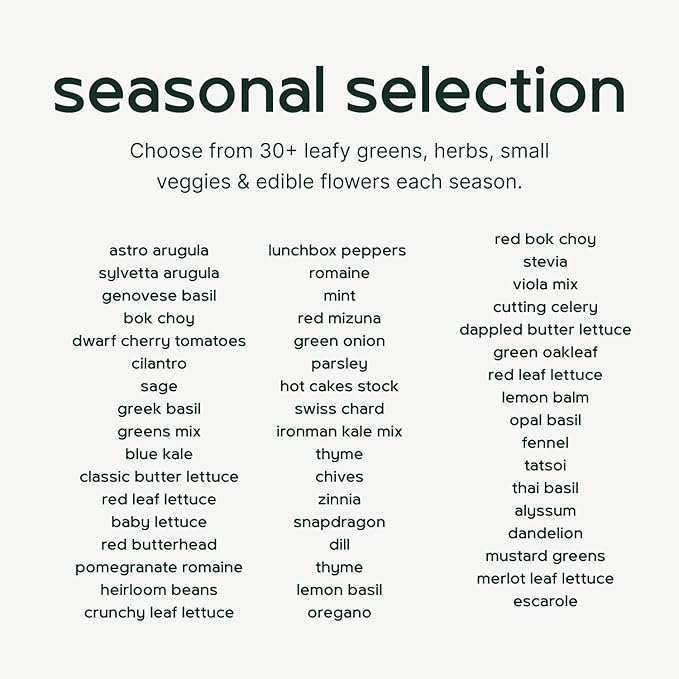 • Effortless access to flavor: Enjoy herbs, greens, and veggies on demand. Quick harvests and guided care bring fresh food to your table anytime.